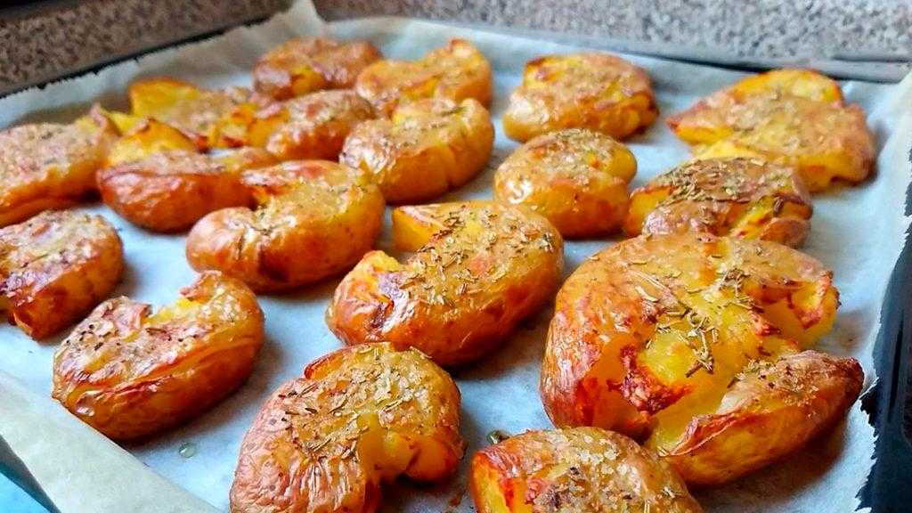 Запекаем «битый картофель» в заранее разогретой до 180°С духовке в течение 25минут до золотистой корочки.