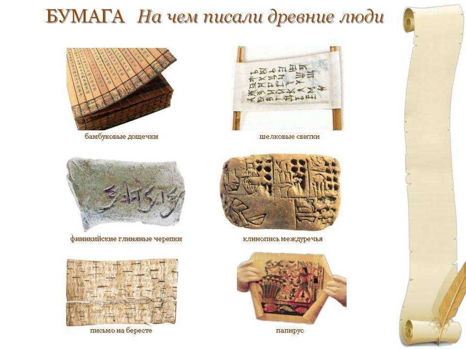 В давние времена, когда бумагу еще не изобрели, люди писали на листьях деревьев, на дощечках, покрытых воском. В Египте использовали папирус, который делали из тростника, росшего на берегах Нила. Затем для письма придумали пергамент — высушенную и обработанную кожу животных. В Китае уже более двух тысяч лет был известен секрет изготовления бумаги из шелка.