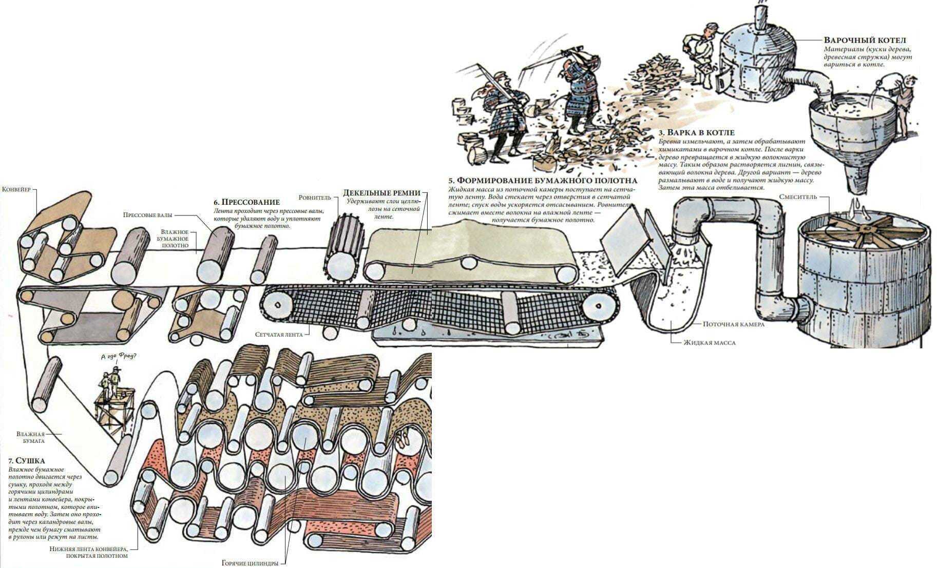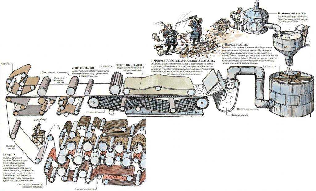 Если бумагу делают из дерева, то для этого используют пасту из древесной коры, воды и всевозможных химических добавок. Такая бумажная паста или древесная масса разминается тяжелыми прессами-валами, а затем просушивается. Потом бумага наматывается в рулон, отделывается, режется и упаковывается.