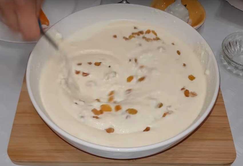 2. Влейте в массу кефир, добавьте изюм, слегка посолите и еще раз перемешайте до однородности.