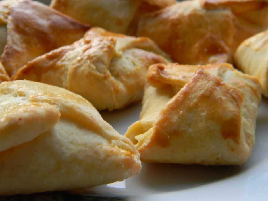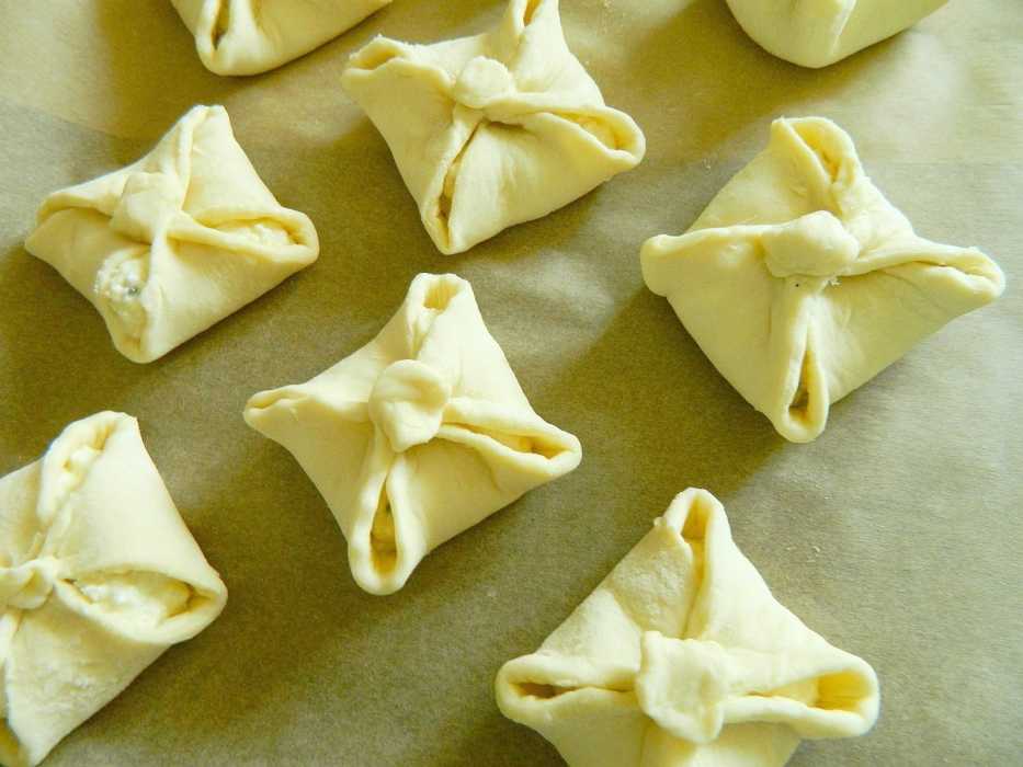 - Выложить начинку на каждый квадратик, сложить каждый по диагонали и защипнуть.