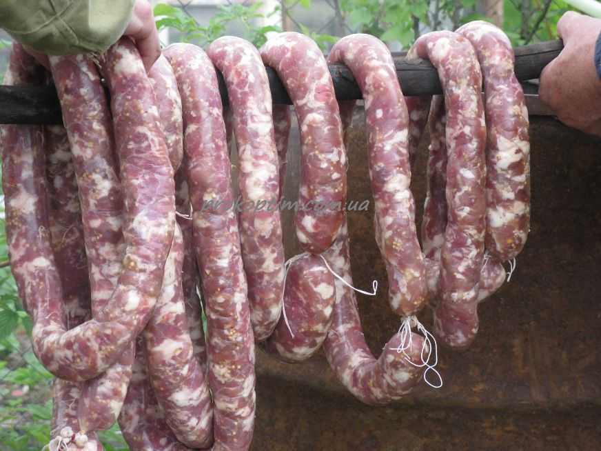 Важно следить, чтобы черева заполнялась фаршем плотно. Колбасы обвязываем веревкой так, чтобы ее было удобно подвесить в коптильне на крючки, и убираем их на балкон немного обсушиться