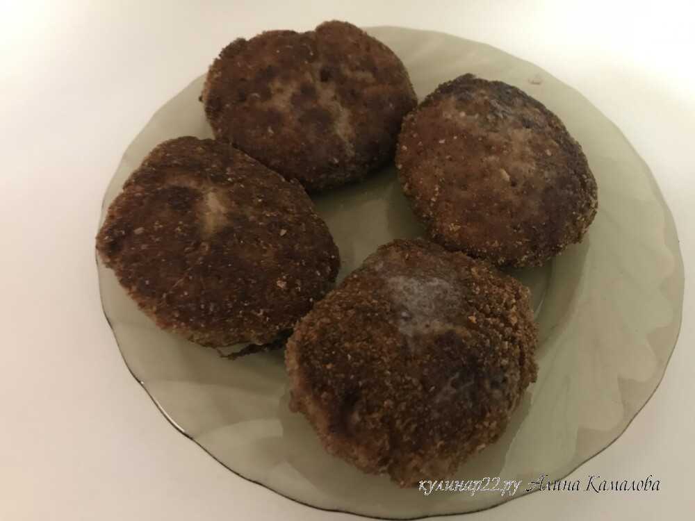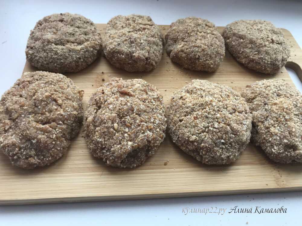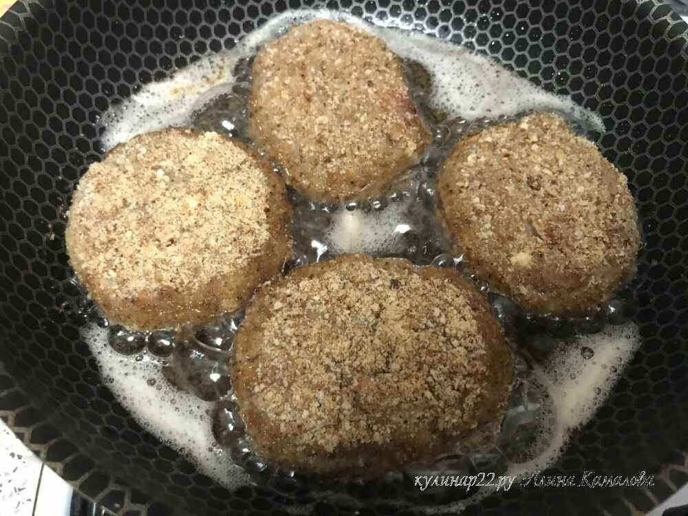 - Выложите в горячее масло только что сформированные котлетки, обвалянные в панировочных сухарях, муке или измельченных овсяных хлопьях.