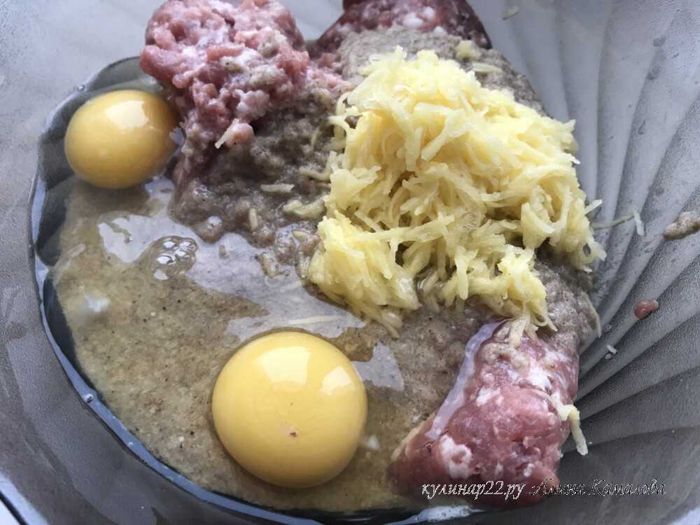 Фарш оттаял, к нему отправляем пробитый через блендер лук, чеснок и хлеб. Далее разбиваем куриные яйца в чашу и натираем картофель на мелкой терке.