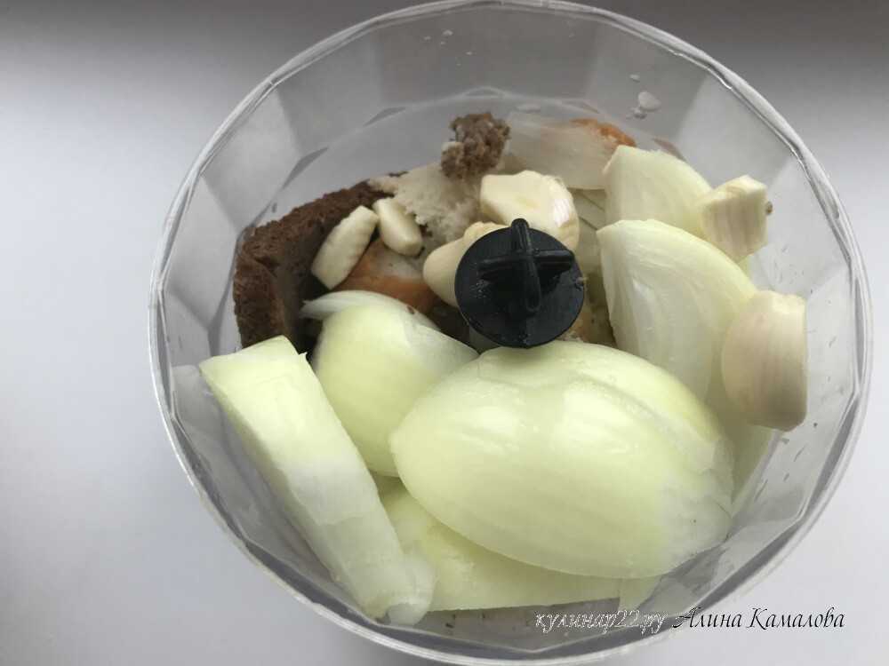 Хлеб замачиваем в теплой воде, отправляем в чашу блендера, туда добавляем очищенный репчатый лук и чеснок. Пробиваем блендером до однородно состояния.