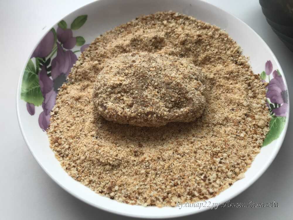 Высыпаем панировочные сухари в чашу, из фарша формируем котлету и обваливаем в сухарях.