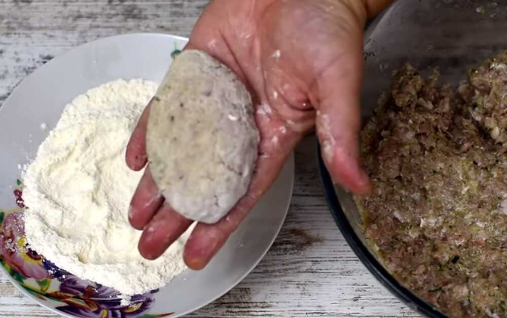 Из мясного фарша формируем небольшой шарик. В чашку насыпаем муку и обваливаем там мясной шарик, затем из руки в руку перекладываем, чтобы стрясти лишнюю муку, а потом придавливаем и получаем в форме котлеты.
