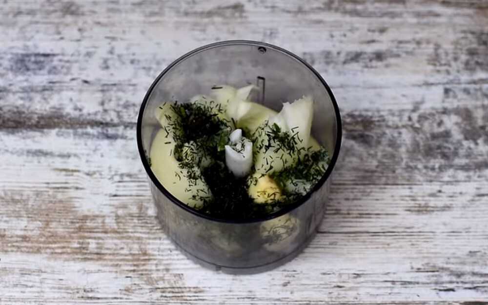 В чашу блендера нарезаем очищенную от шелухи головку лука, зубчики чеснока без кожицы и добавляем свежий измельчённый укроп. Превращаем всё в однородную массу.