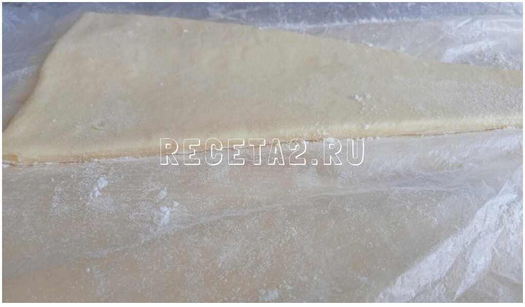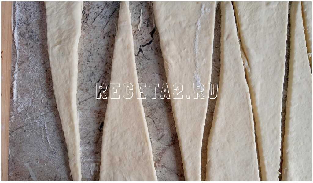 - Из теста раскатываются не слишком толстые пласты, которые затем разрезаются на равноценные треугольники.