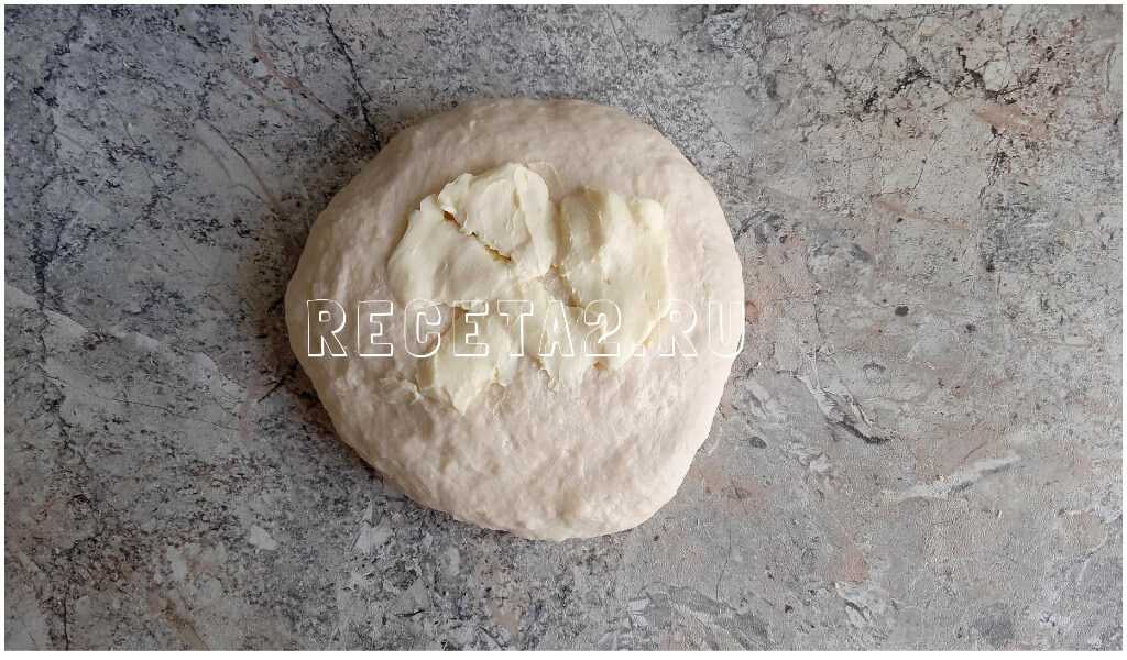 3. Последний ингредиент – это сливочное масло. Оно должно быть размягченным. Продолжаем его вымешивать, а также с силой отбиваем его о поверхность столешницы. Так тесто лучше насыщается кислородом.