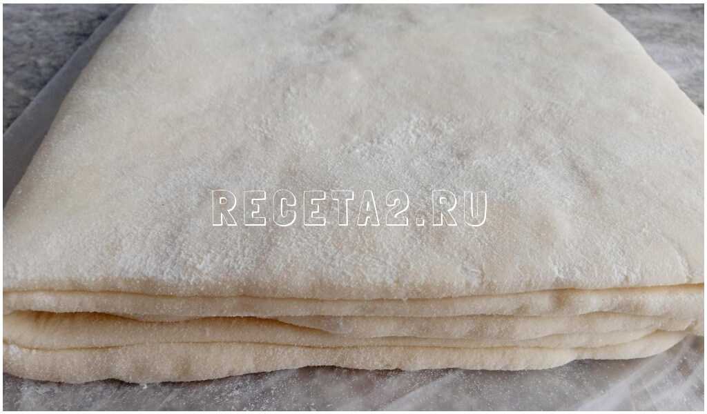 8. Вновь делаем раскатку в прямоугольный пласт, но теперь сворачиваем тесто в 3 слоя и определяем заготовку в холодильник. Ждем 1 час.