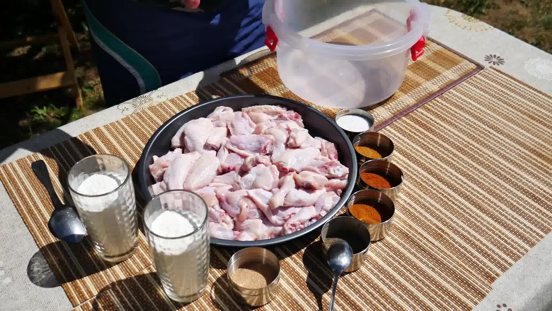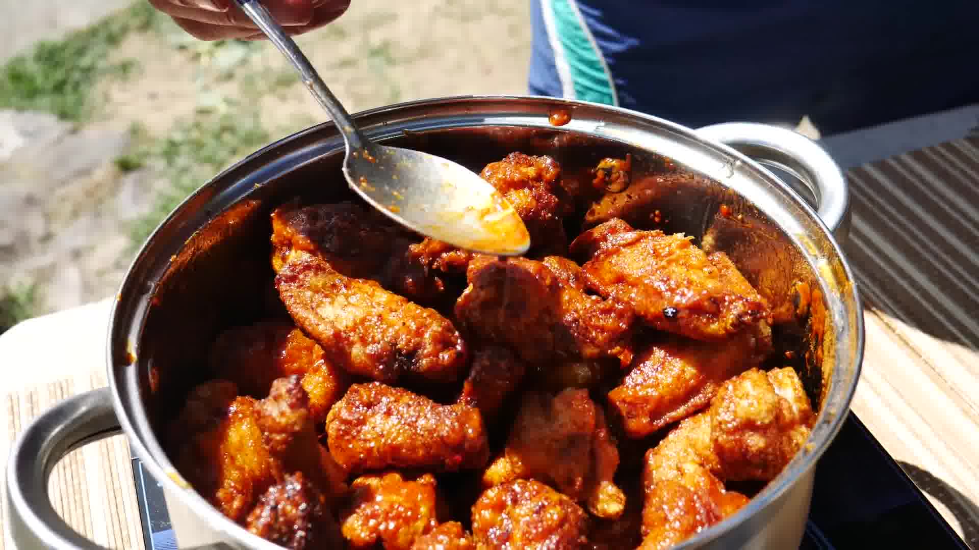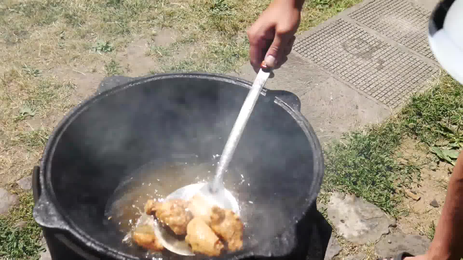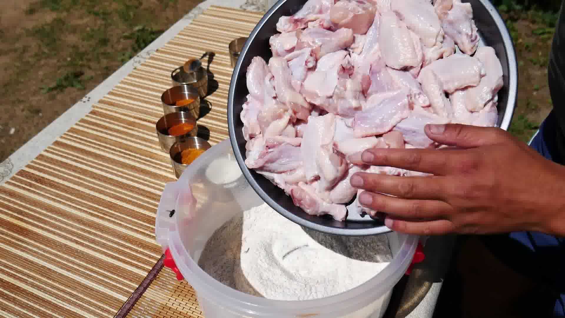 Разожгите костер, раскалите в нем растительное масло и выложите крылья в казан. Поджаривайте с каждой стороны, пока они не станут хрустящими и золотистыми.