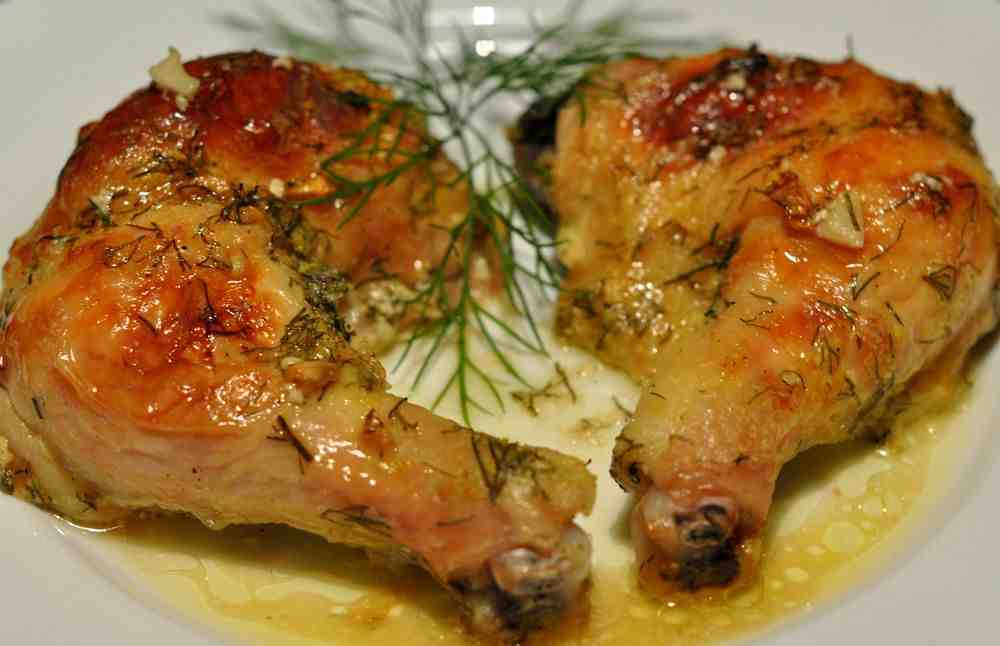 Полученным маринадом обмазываются подготовленные куски курятины и оставляются примерно на полтора — два часа, а затем отправляются запекаться в духовку. Через тридцать минут блюдо готово.