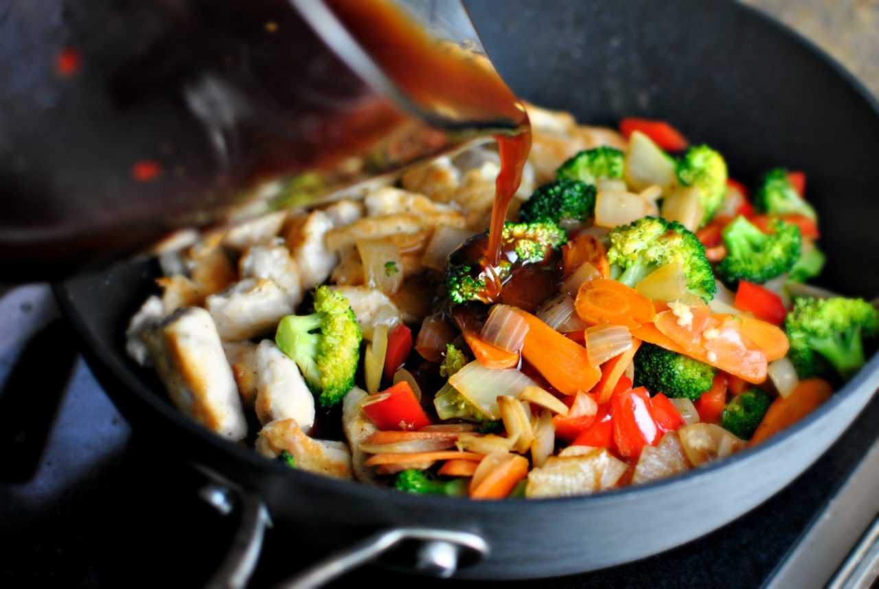 Курица с овощами в кисло-сладком соусе на сковороде