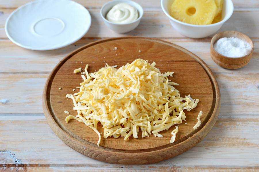 Плотно засыпаем кусочки ананаса сырной стружкой.