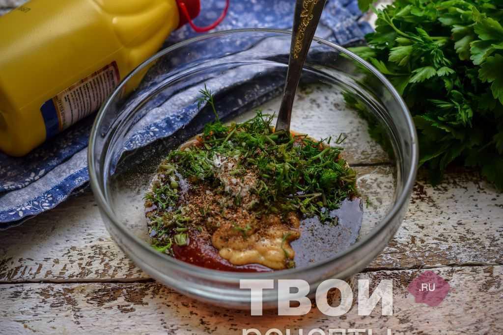 Добавить мед, всыпать специи, нарубить пучок любимой зелени. Все ингредиенты соуса перемешать, снять пробу на соль, при надобности добавить специи еще.