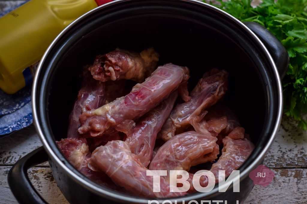 Тщательно их промываем, я убираю лишний жир и пленки и кладем в воду, будем варить. варю я их подольше, ставлю в мультиварке программу «суп» на час. Потом достаю шеи и выкладываю на сковороду