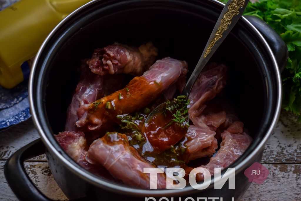 Шейки опустите в маринад. Хорошо перемешайте, чтобы кусочки покрылись соусом. Накройте посуду крышкой. Оставьте мариноваться на несколько часов в прохладном месте. Периодически перемешивайте, чтобы все шейки равномерно промариновались. Чем дольше мариновать мясо, тем больше оно насытиться пряностями.