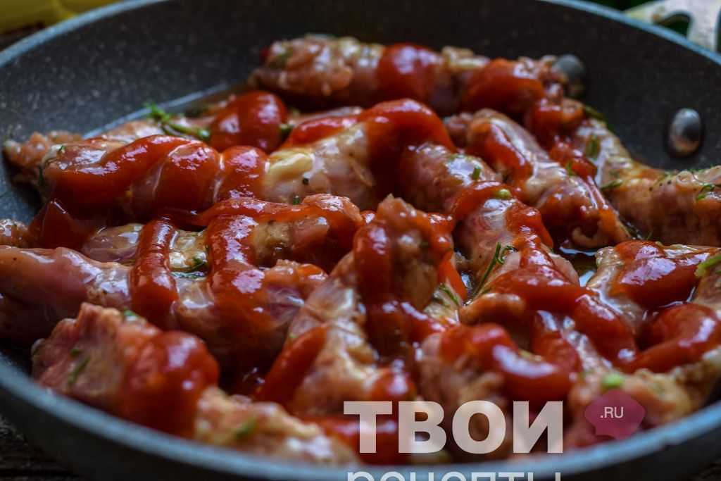 Переложить шейки в прогретую сковороду с маслом, влить оставшийся кетчуп. Накрыть сковороду крышкой, готовить около часа на среднем огне – за это время соус станет очень густым, заметно уменьшится, шейки будут карамельного цвета с приятной корочкой.