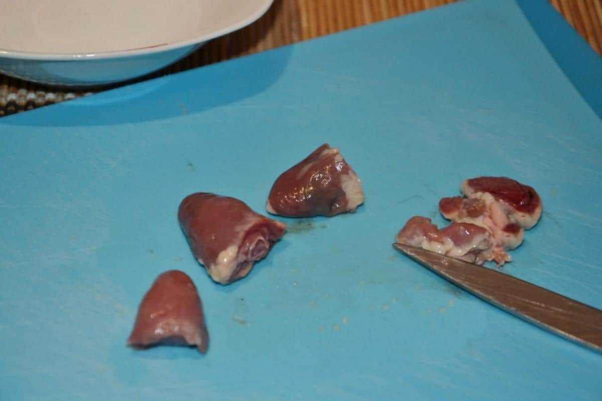 1. Заранее нужно отварить промытые сердечки и желудки.