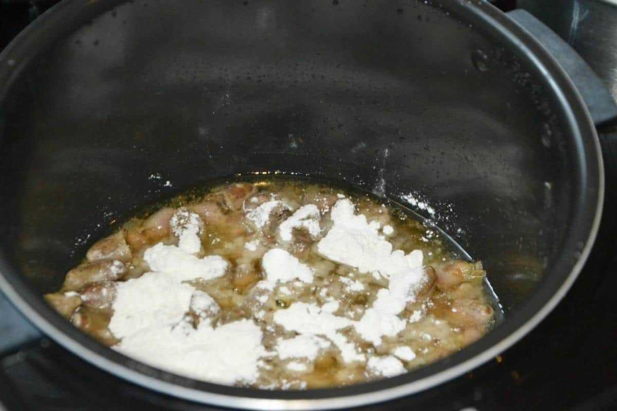 Полчаса прошли, и теперь добавляем столовую ложку муки. На этом же этапе добавляем все специи, тщательно перемешиваем – ведь ни один комочек нам не нужен.