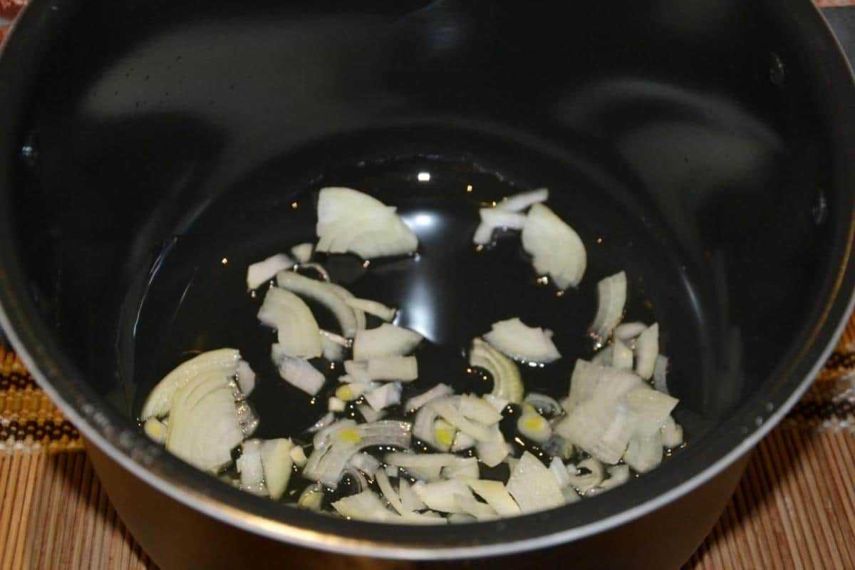 5. На горячую сковороду наливаем масло. Первоначально слегка обжариваем чеснок. Он придаст аромат маслу и отличный вкус. Затем положим лук. Постоянно помешиваем, пока не появится золотистый цвет