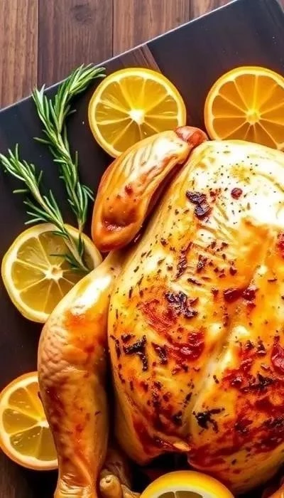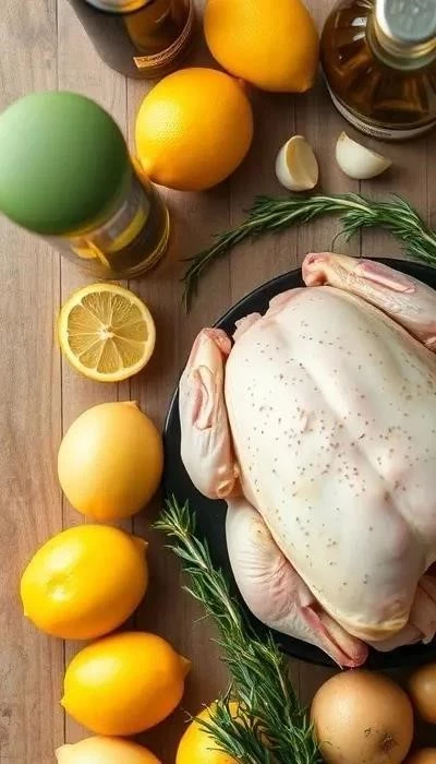 - Подготовка курицы: Достаньте курицу из маринада. Положите внутрь половинки лимона, нарезанного кружочками, и веточки розмарина и тимьяна.
