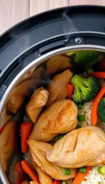 Подавайте курицу с рисом и овощами в мультиварке горячей, посыпав свежей зеленью и кунжутом. Блюдо отлично сочетается с легкими овощными салатами или маринованными овощами. Можно подать с соусом чили для любителей острого.