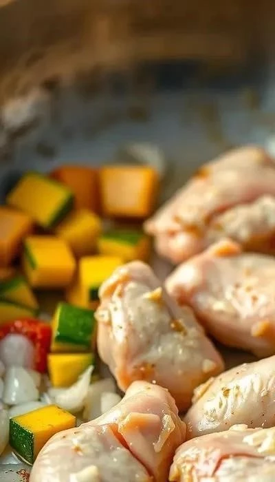 - Добавление лука и моркови: Добавьте к курице лук и морковь, обжаривайте еще 3-5 минут, пока лук не станет прозрачным.