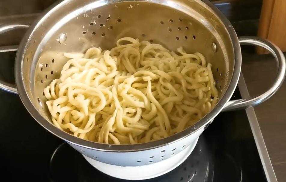 Когда лапша доведена до нужной кондиции, можно ее готовить. Для этого воду доводят до кипения, солят, а потом кидают в нее жгуты. После варки лапшу необходимо промыть в холодной воде.