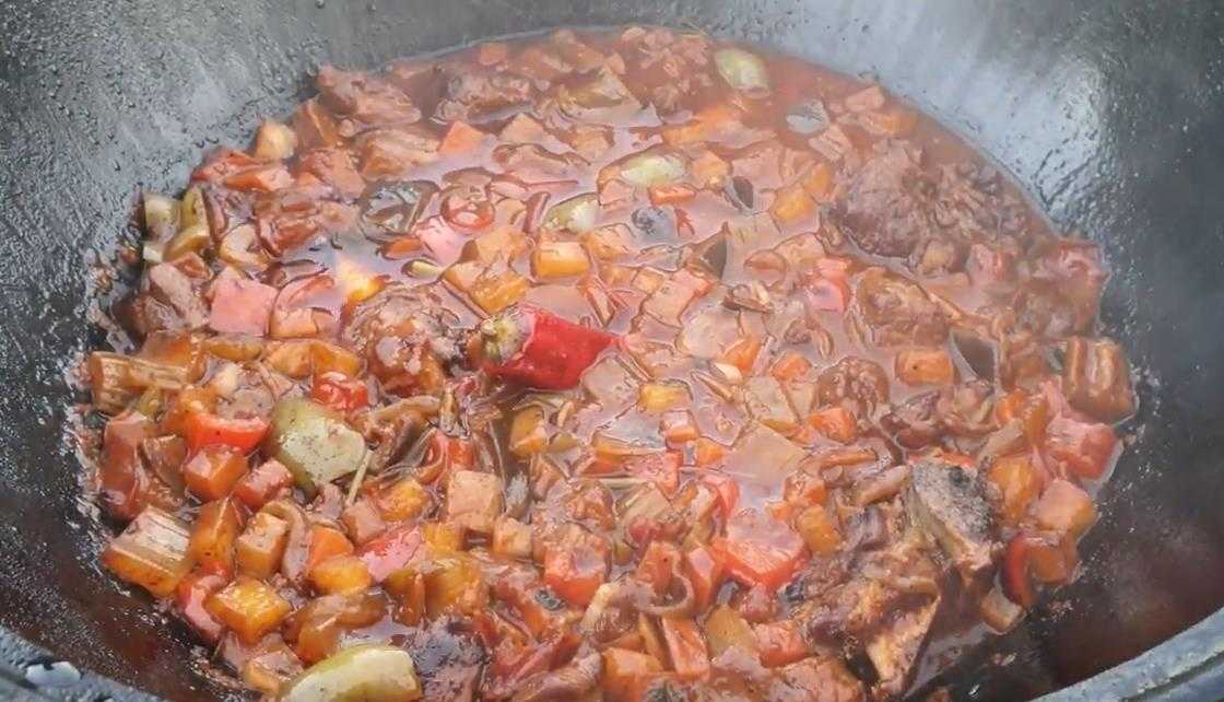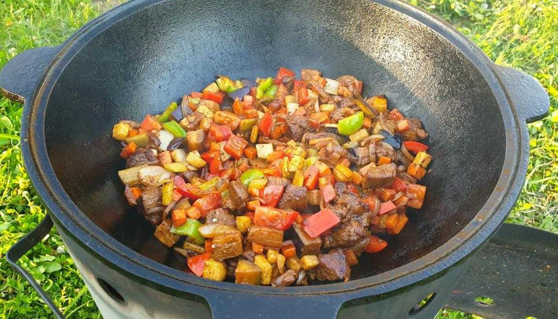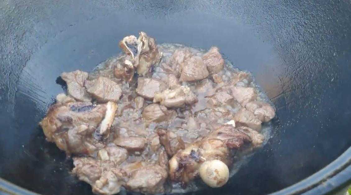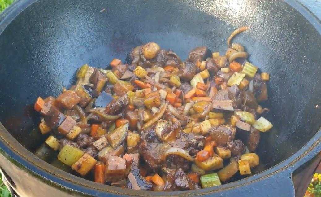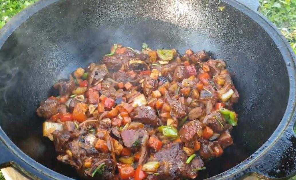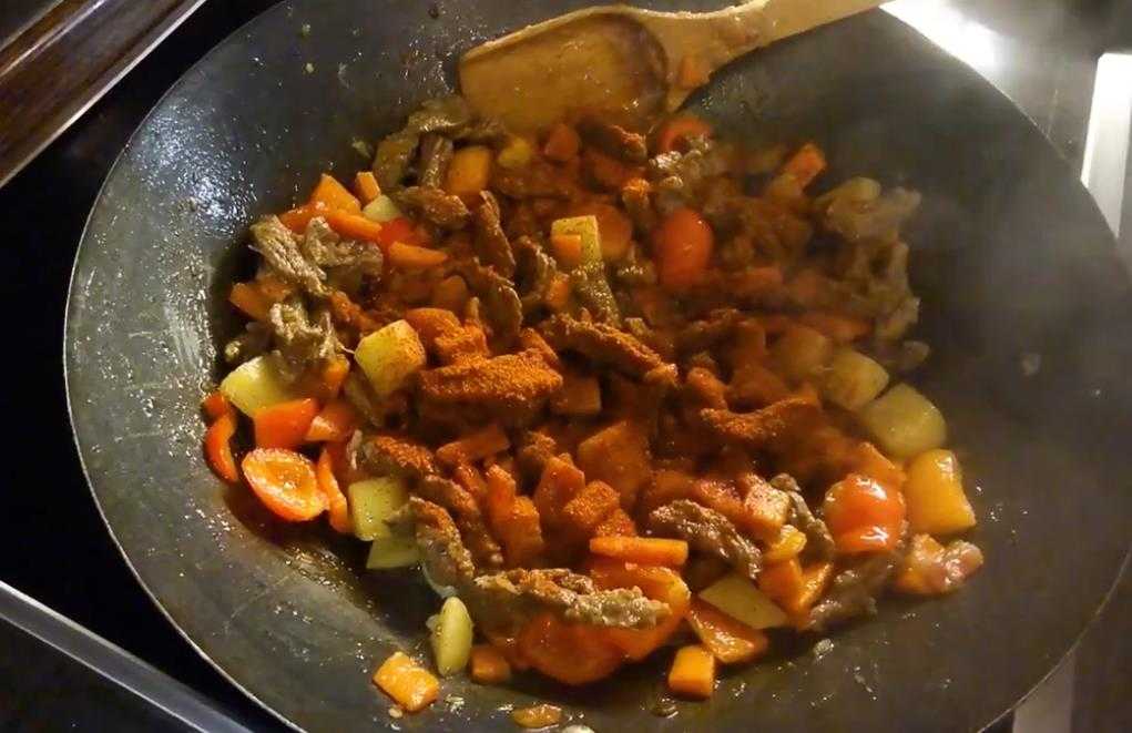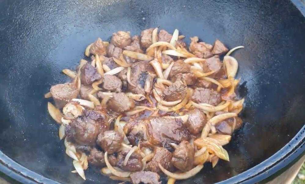 Теперь предстоит готовить заправку с говядиной и овощами. Сначала в казане в горячем жиру обжаривают мясо. Когда в процессе приготовления оно станет золотистым на фото, можно класть в посуду овощи. В конце добавляют воду, уменьшают огонь и оставляют продукты на плите, чтобы они протомились в течение 10-15 минут.