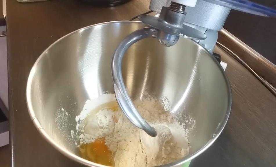 2. Всыпайте небольшими порциями муку и перемешивайте миксером. Когда тесто станет более густым, то продолжайте смешивание руками. Если имеете тестомес, то процедура приготовления теста значительно упрощается.