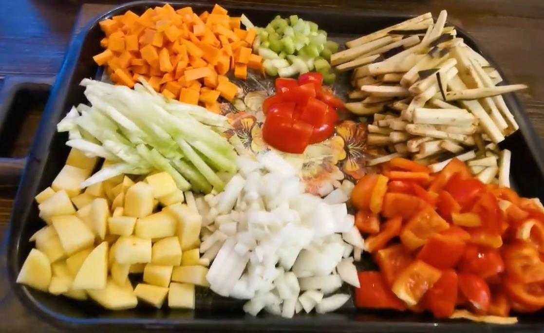 6. Готовим ваджу: лук нарезаем кольцами, морковку, редьку – средним кубиком, болгарский перец – соломкой, помидоры без кожицы – кубиком, джусай и зеленую фасоль – кусочками толщиной 3 см, чеснок – пластинками, 1 жгучий перец режем соломкой.