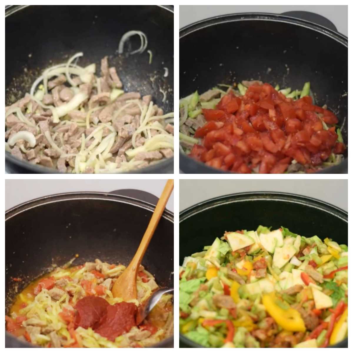 В глубокий казан вливаю растительное масло. Кусочки мяса я сначала обжариваю на сильном огне, немного солю, затем тушу вместе с подготовленными овощами. Сначала в казанок бросаю лук, потом помидоры, перец, сельдерей, кабачок, пекинскую капусту. Каждый ингредиент я протушиваю на среднем огне по 2 – 3 минутки. Добавляю две ложки томатной пасты.