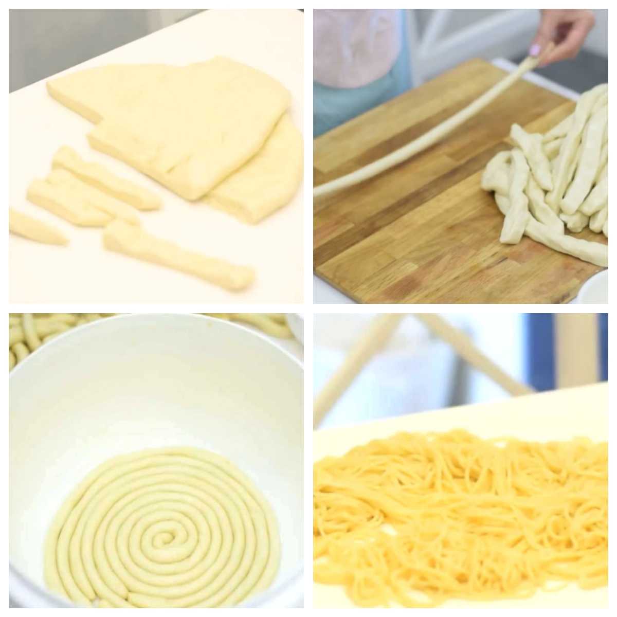 - Тесто обмять, дать полежать еще 10 минут. Разделить шар на 4 кусочка, раскатать каждый в тонкий пласт. Свернуть в плотный рулет, нарезать тонкой соломкой.