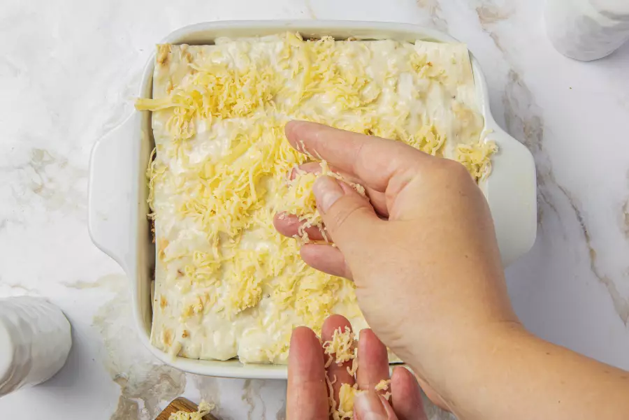 Шаг 7 Заготовку полейте оставшимся соусом бешамель и посыпьте тёртым сыром. Выпекайте в предварительно разогретой до 180 градусов духовке до румяности сыра (25-30 минут).