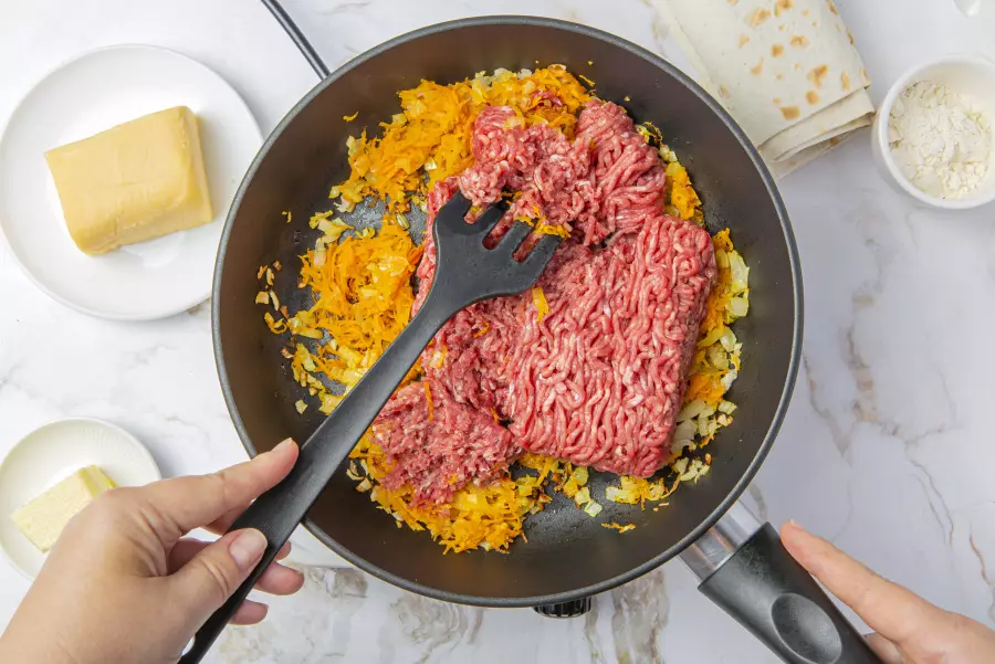 Шаг 3 В сковороду с зажаркой добавьте фарш. Обжаривайте на среднем огне, помешивая и разбивая крупные комочки, до полуготовности (7-8 минут).