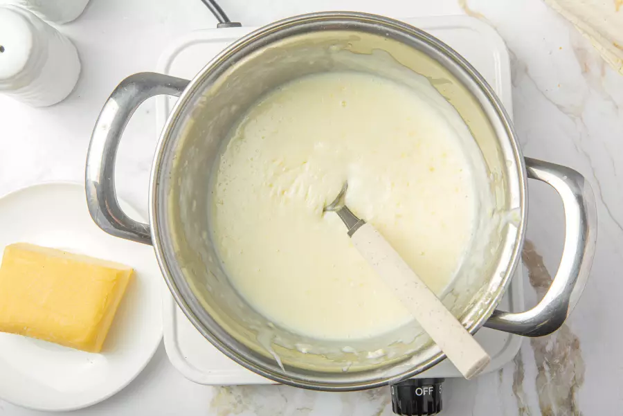 Шаг 4 Для соуса «Бешамель» в микроволновой печи или в кастрюле подогрейте молоко. В небольшой кастрюле или ковшике растопите сливочное масло. Всыпьте муку и обжаривайте, помешивая, до золотистого цвета. Затем, постоянно помешивая, тонкой струйкой влейте горячее молоко. Варите на медленном огне, пока смесь не загустеет.