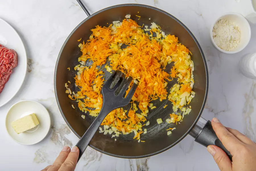 Шаг 2 В сковороде разогрейте оливковое масло. Выложите лук, обжарьте его до прозрачности. Затем добавьте тёртую морковь, перемешайте и обжаривайте пару минут.
