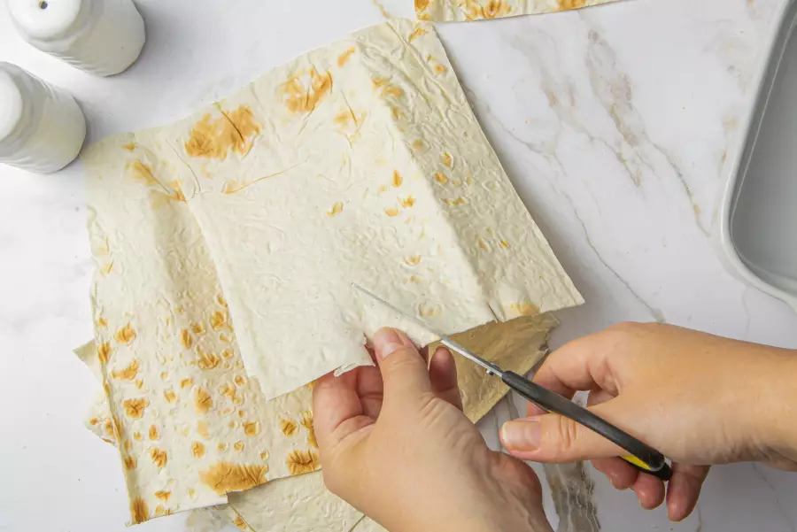 - Лаваш разрезаем по размерам любимой формы и начинаем собирать. Слой лаваша — соус — начинка, повторяем до верха, пока не закончатся заготовки. Последним должен быть лаваш, который смажем соусом и притрусим тертым сыром.