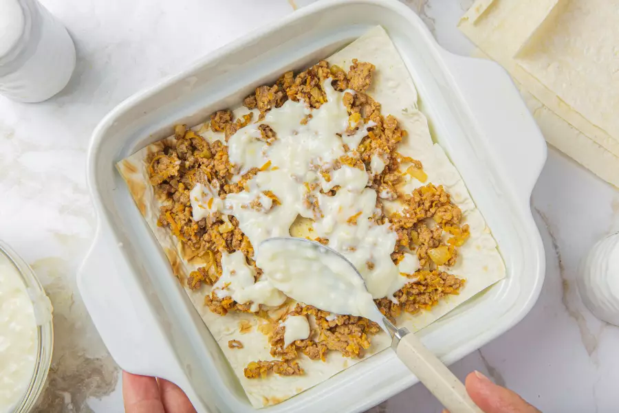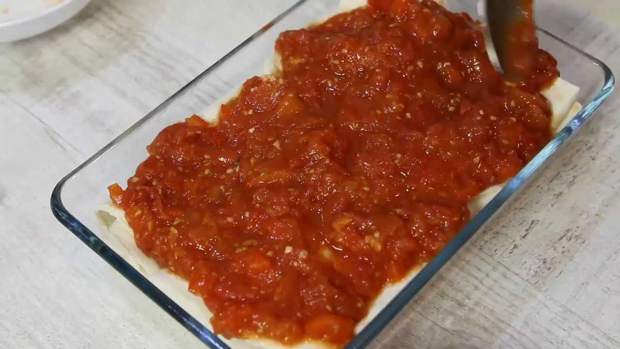 Шаг 6 На дно формы для запекания влейте немного соуса. Сверху положите лист лаваша. Затем выложите немного мясной начинки, распределите её по листу и полейте небольшим количеством соуса. Накройте начинку листом лаваша и повторите действия, пока ингредиенты не закончатся.