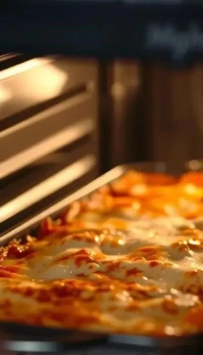 Запекайте лазанью в предварительно разогретой до 180°C духовке в течение 30-40 минут, пока она не станет золотистой и пузырчатой.