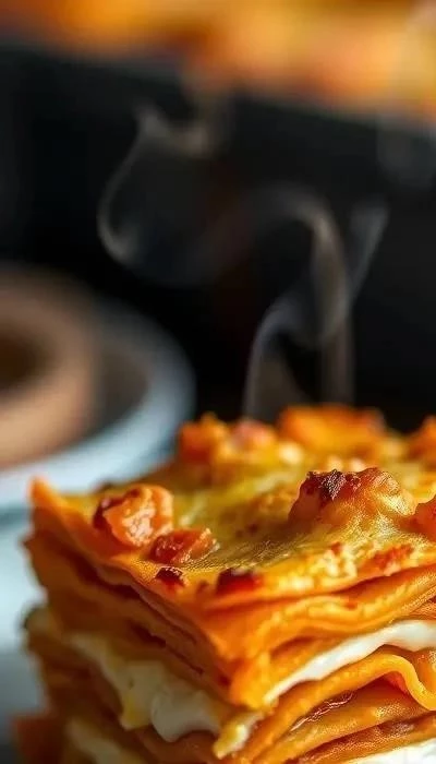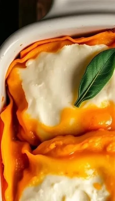 6. Повторите слои: листы лазаньи, тыквенный соус, рикоттная начинка, белый соус.
