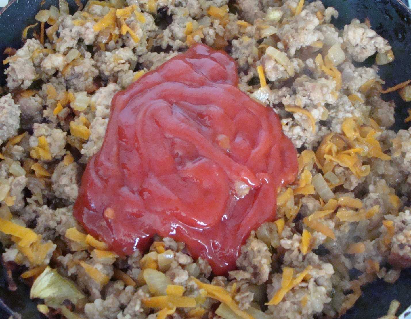 2. В лук и морковь добавляем фарш и кетчуп, обжариваем до готовности