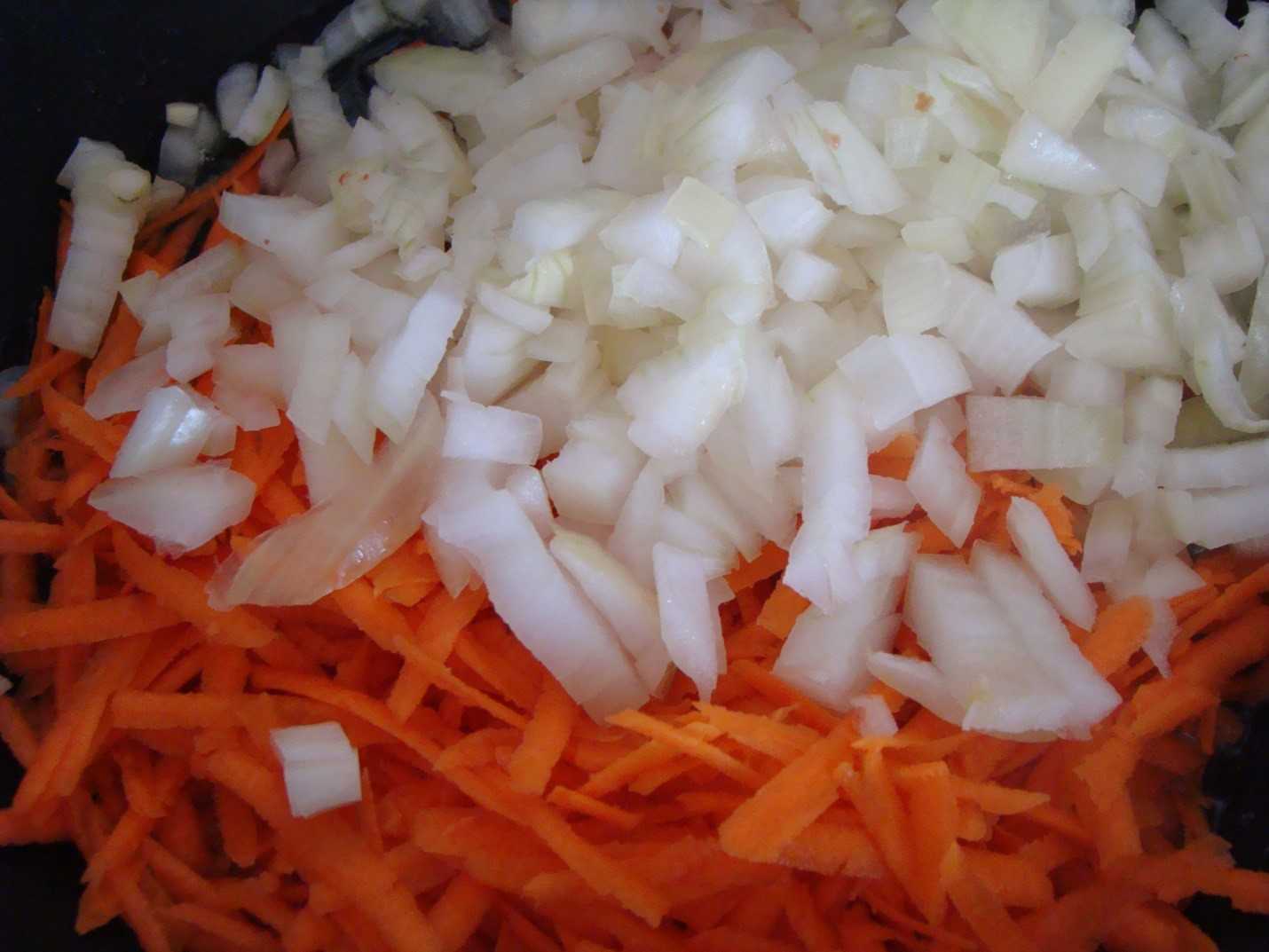 1. Очищаем лук и морковь. Порежем мелко лук, морковь натрем на крупной терке. Пассеруем лук и морковь 15-20 минут на среднем огне.