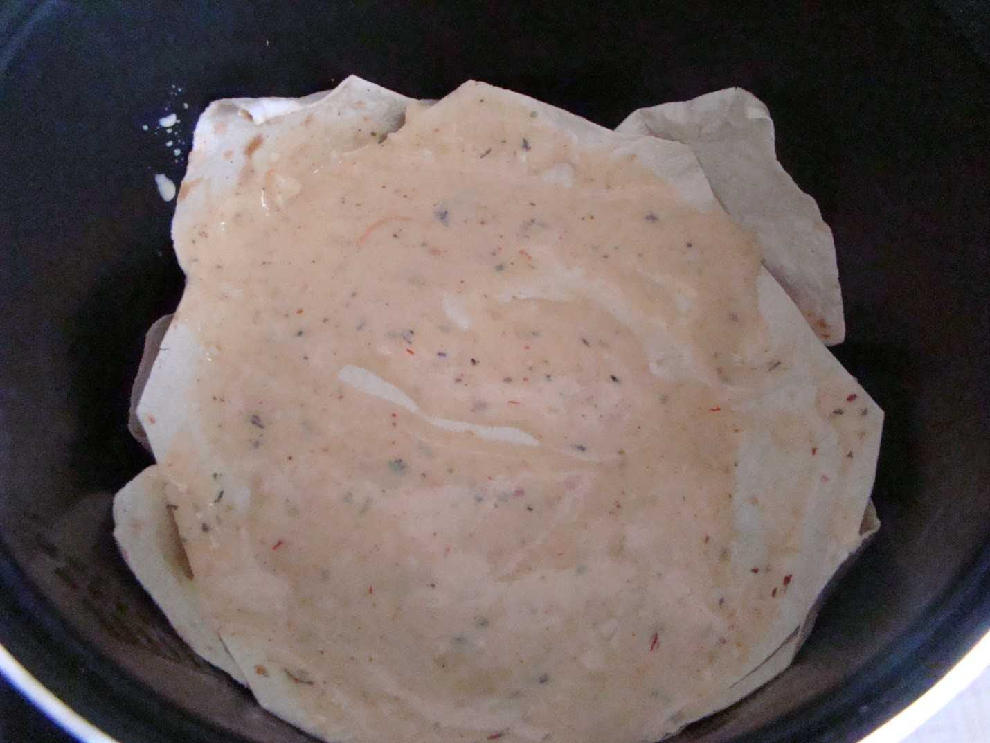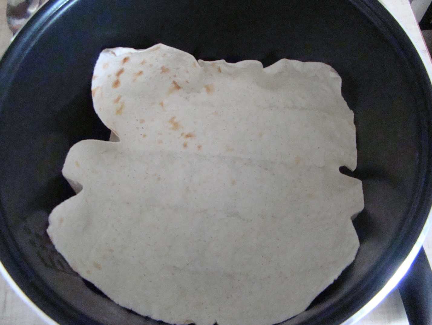 1. В чашу мультиварки выкладываем лист лаваша, предварительно выстилая дно пергаментной бумагой. Если форма у лаваша квадратная – края можно загнуть.