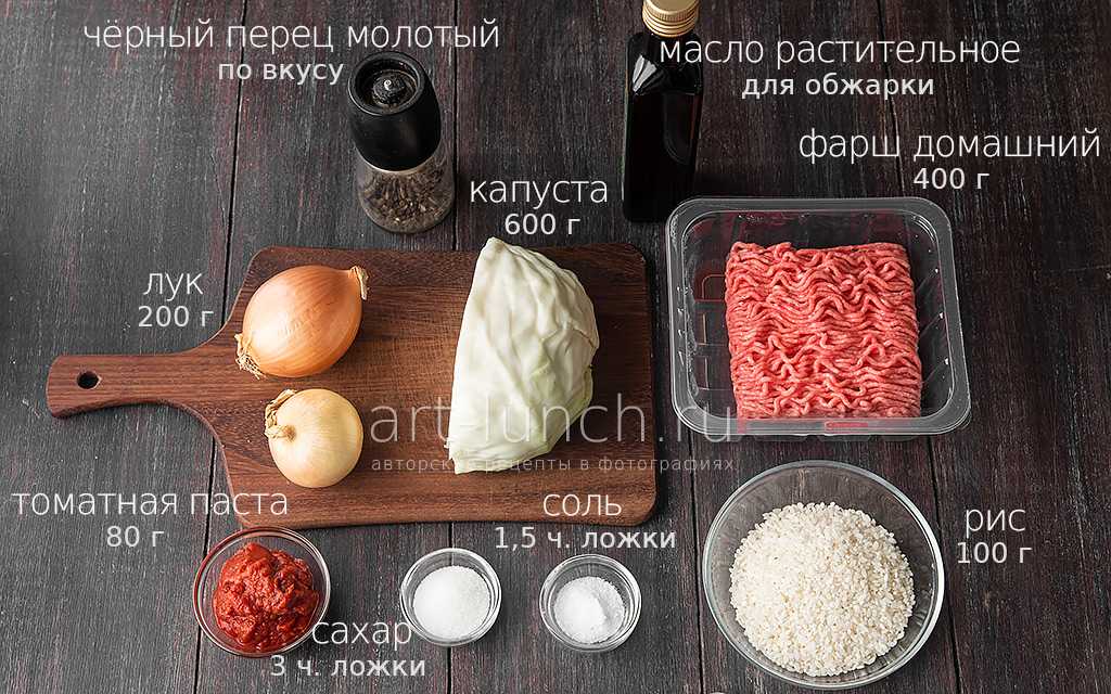 Ингредиенты: — нежирное мясо – 350 гр; — капуста белокочанная – 200 гр; — рис (сухая крупа) – 0,5 стакана; — лук репчатый – 1 головка; — морковь – 1 небольшая (не обязательно); — яйцо – 1 шт; — томатный соус – 4 ст. ложки; — сметана нежирная (10%) – 4 ст. ложки; — вода – 0,5 стакана; — соль – по вкусу; — масло растительное – 1 ст. ложка.