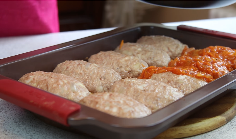 Сначала идет ряд котлеток, затем немного заливки и т.д., пока не используем всю массу.