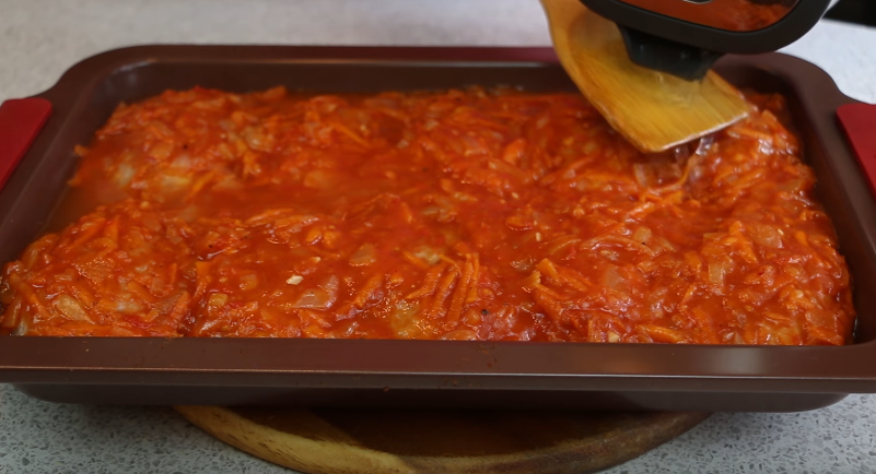 Этим соусом поливаем голубцы. Нужно добиться, чтобы заливка почти полностью покрывала продукты. В процессе тушения она сильно выкипит, поэтому ее можно залить побольше.