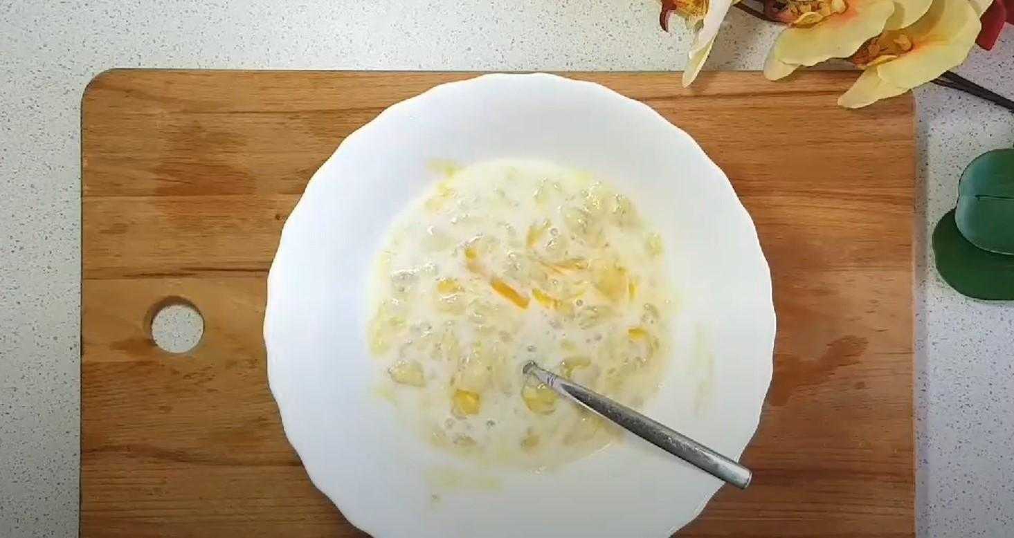 - Яйцо взбить вместе с молоком. Добавить предварительно растопленное и остывшее сливочное масло. Продолжать вымешивать.